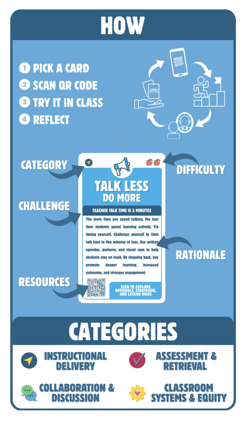 I created Lesson Shuffle after realizing I was doing most of the talking while my learners did most of the listening. They were compliant but not really thinking, discussing, or applying what they knew.I started collecting simple strategies that helped me talk less and helped my learners do more. Over time, those routines turned into a stack of cards I kept on my desk to plan lessons and save tired days.Lesson Shuffle is the deck I wish I had earlier. It is designed to help busy educators quickly choose a strategy, get learners moving and thinking, and build more consistent, student centered learning experiences.