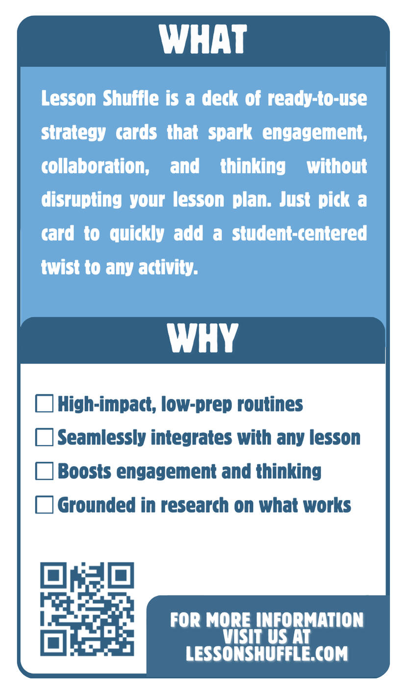 Lesson Shuffle is a deck of instructional strategy cards that makes it easy to turn any lesson into an active, student centered experience. Each card gives you a clear objective, step by step directions, and ideas to adapt for different learners.*Quick, student centered activities